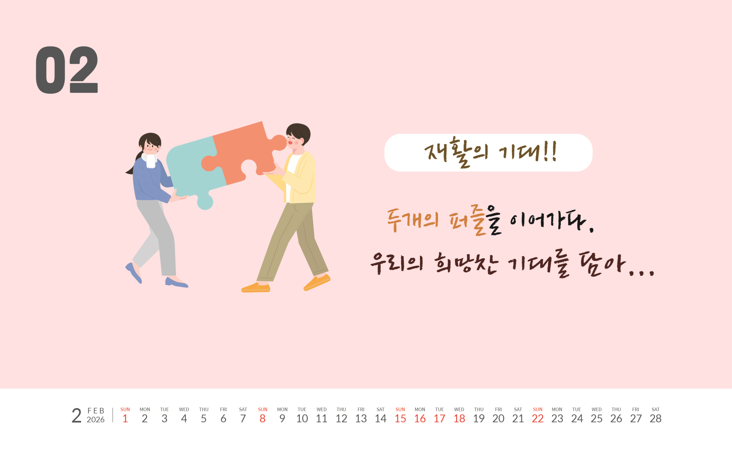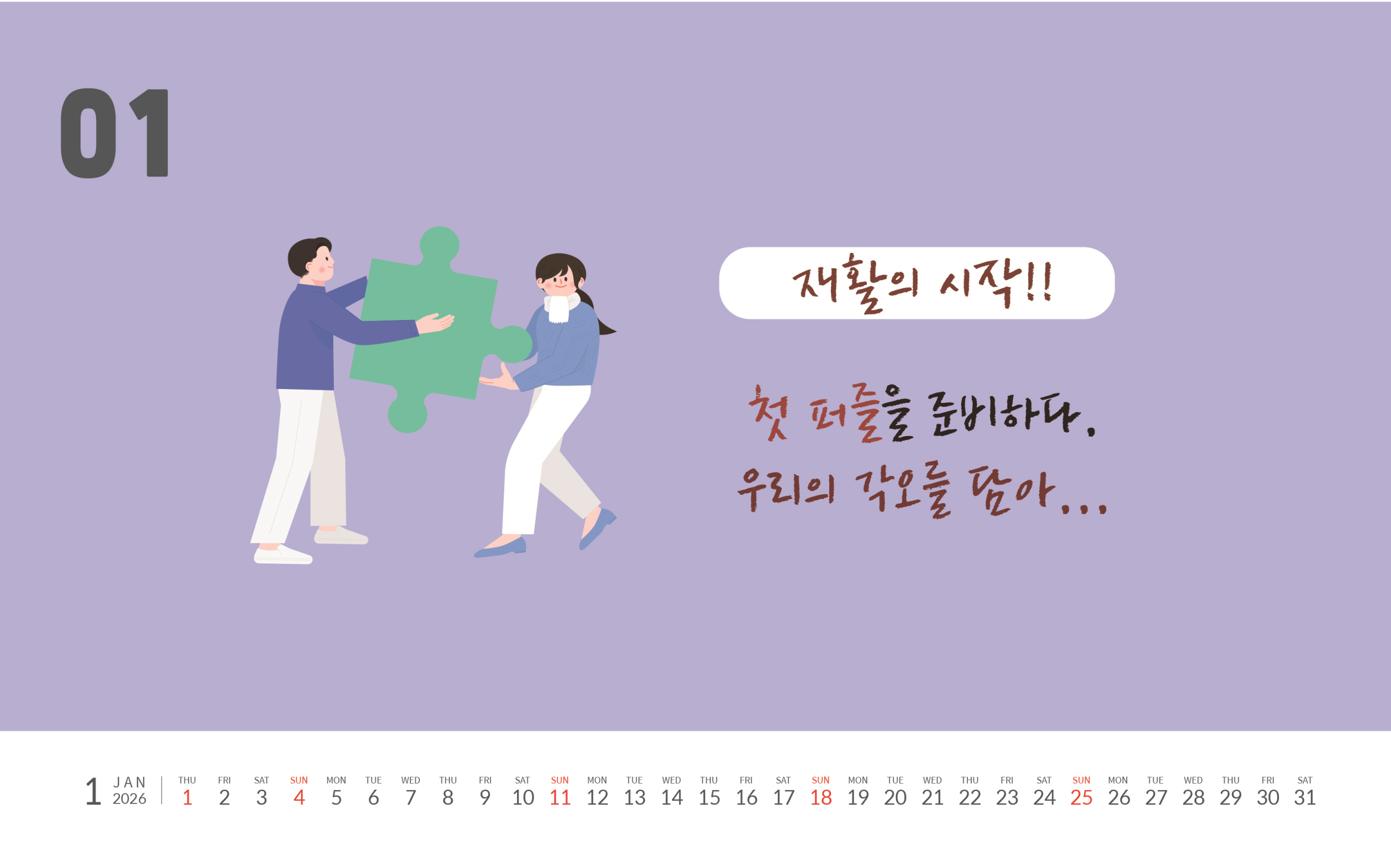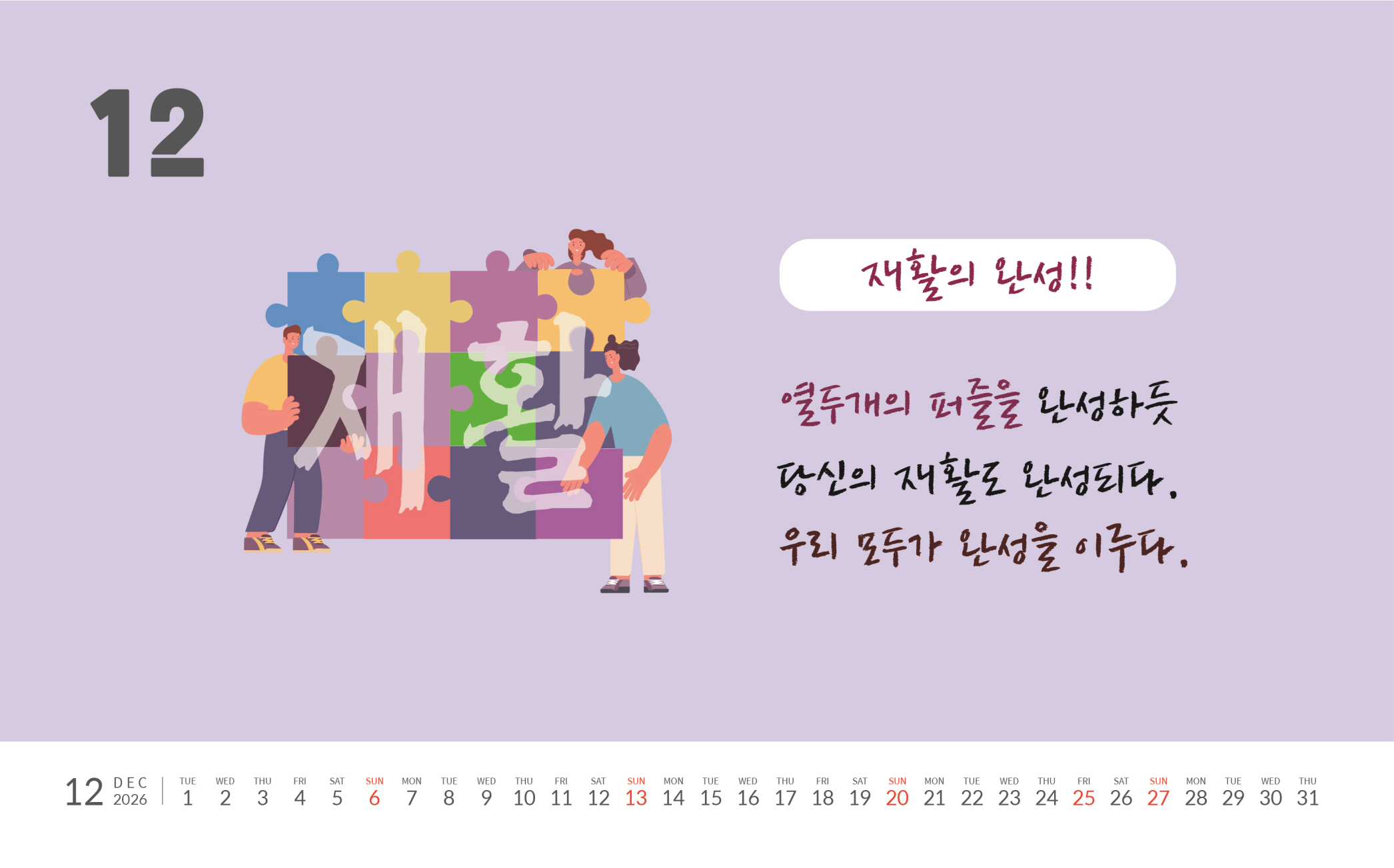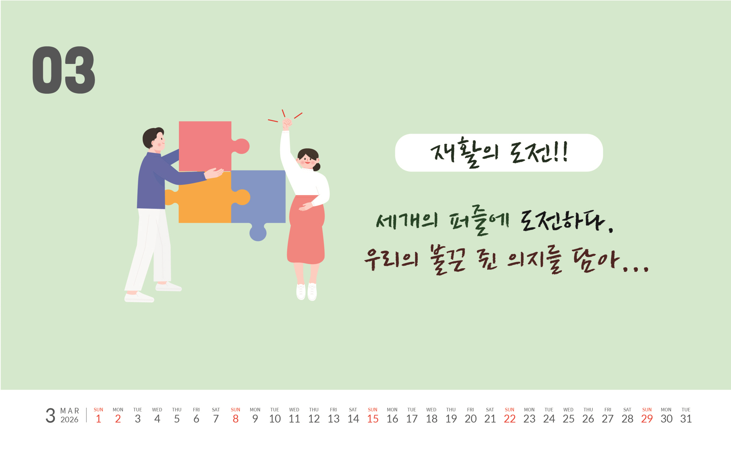 ¾È³çÇϼ¼¿ä. õ¾ÈÀçȰº´¿ø¿¡¼­ Á¦ÀÛÇÑ 2026³â Ź»ó´Þ·ÂÀ» ³ª´®Çϰí ÀÖ½À´Ï´Ù. "õ¾ÈÀçȰº´¿ø 2026³â ´Þ·Â ¾È¿¡ ¼û°ÜÁø ÀçȰÀ̾߱â"¶ó´Â ÄÁ¼ÁÀ¸·Î ¸¸µé¾îÁø ´Þ·ÂÀÔ´Ï´Ù. 1³â 12°³¿ùÀ» ÆÛÁñ 12Á¶°¢À¸·Î Ç¥ÇöÇÏ¿© ÆÛÁñ 1Á¶°¢À» ÀçȰÀÇ ½ÃÀÛÀ¸·Î 12Á¶°¢À» ¸ÂÃç¾ß ÀçȰÀÌ ¿Ï¼ºµÈ´Ù´Â ÀǹÌÀÇ ´Þ·ÂÀÔ´Ï´Ù. 1³âÀÇ °úÁ¤¿¡¼­ ÀçȰÀÇ Ã¹°ÉÀ½ ½ÃÀÛºÎÅÍ ÀçȰÀÇ µµÀü°ú ¿­Á¤, ±×¸®°í ¸ñÇ¥¸¦ ÇâÇØ ÁúÁÖÇÏ¿© ¸¶Ä§³» ¿Ï¼º¿¡ À̸£´Â 1³â 12´ÞÀÇ ¿©Á¤À» ´ãÀº... ÀÌ ´Þ·ÂÀÇ ¸Þ½ÃÁö ¸¸Å­À̳ª 1³â ³»³» ¿­Á¤À» ´ÙÇØ ³ë·ÂÇϴ õ¾ÈÀçȰº´¿øÀÌ µÇ°Ú½À´Ï´Ù. ¿ì¸® ¸ðµÎ°¡ ÀçȰ ÆÛÁñÀ» ÇÑÁ¶°¢ ÇÑÁ¶°¢ ¸ÂÃ糪°¡ º¸¾Æ¿ä~^^