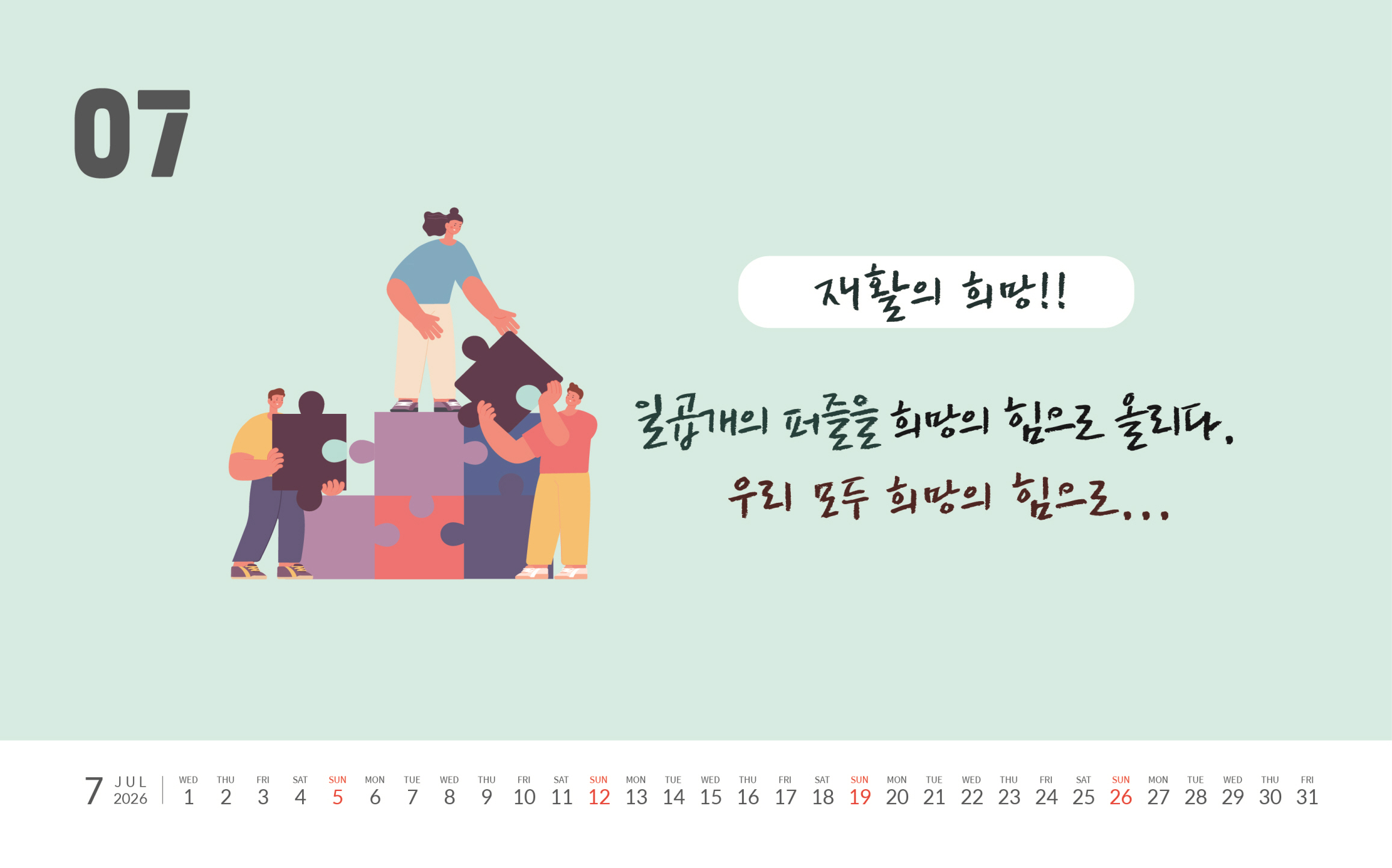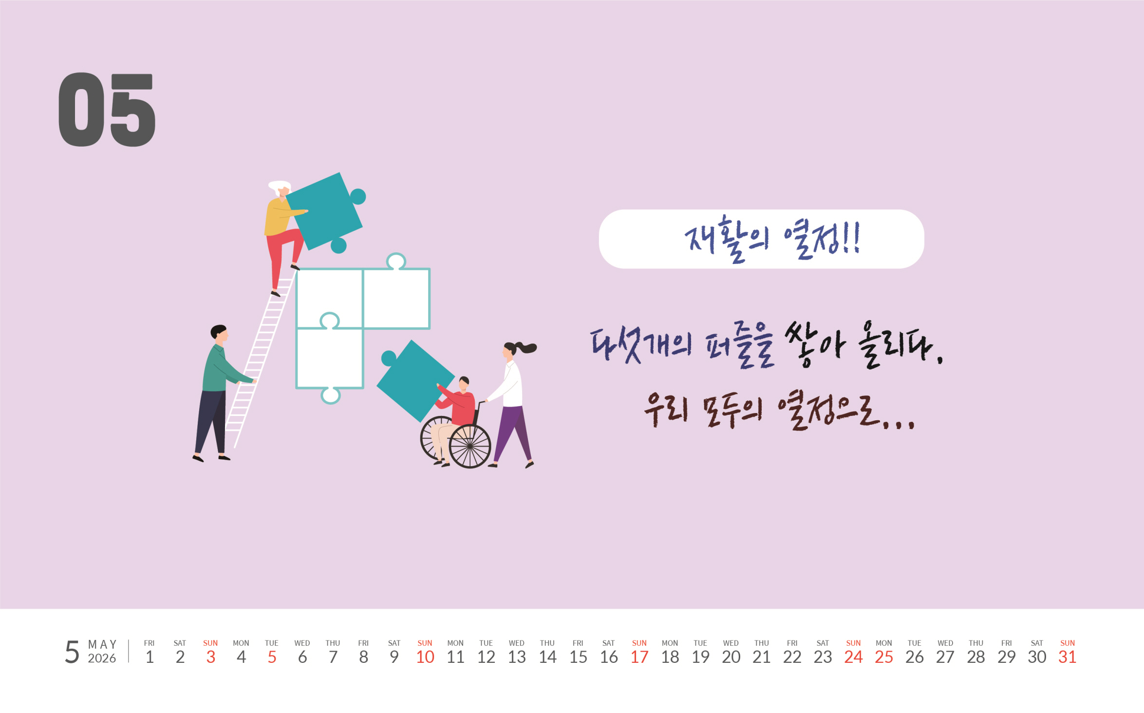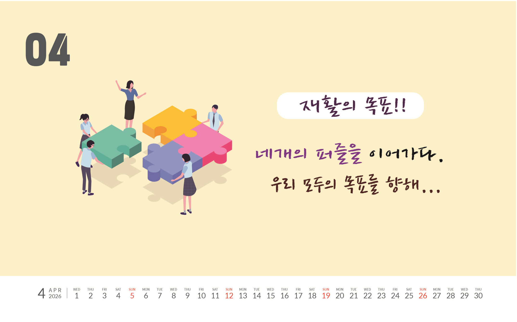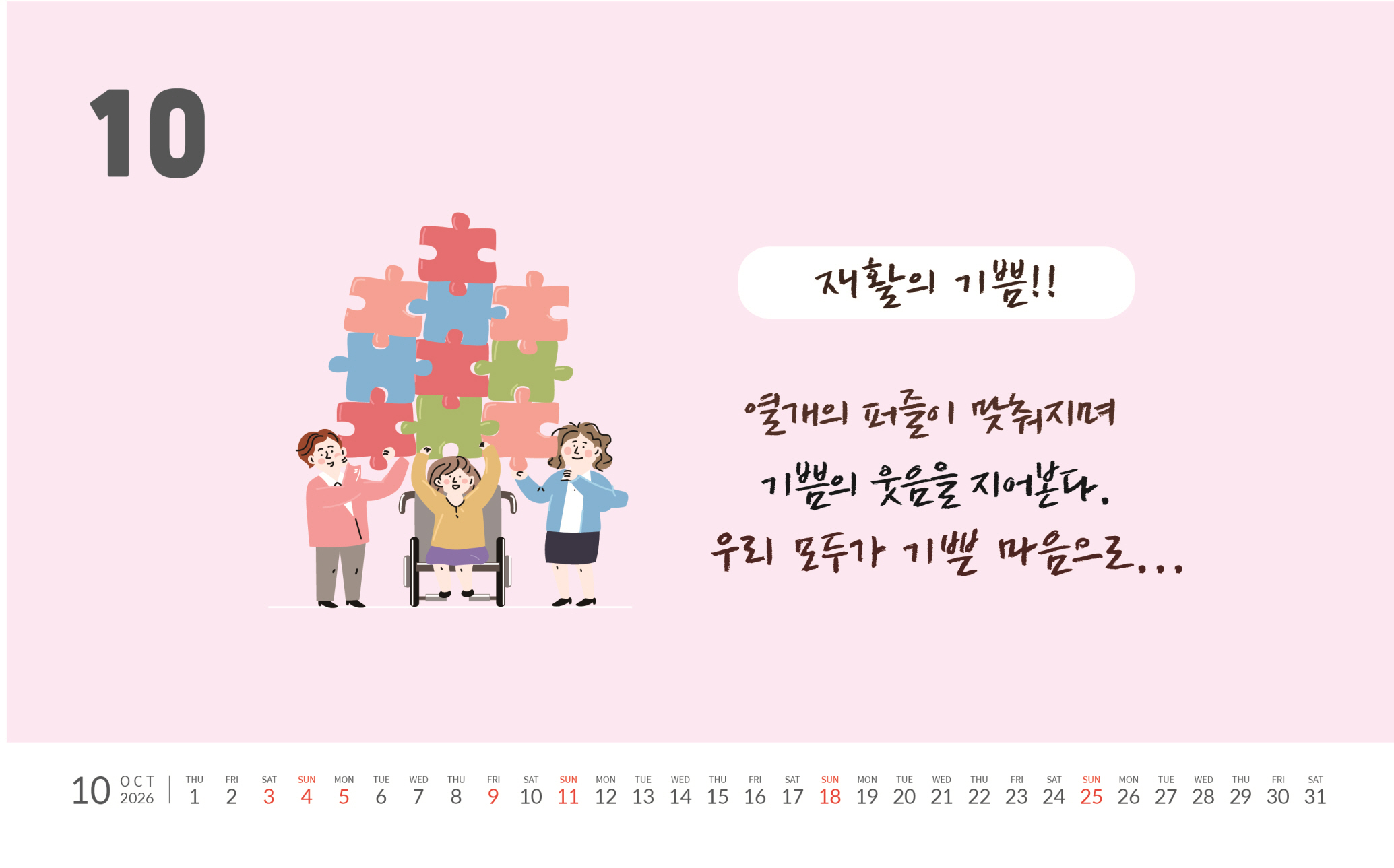 ¾È³çÇϼ¼¿ä. õ¾ÈÀçȰº´¿ø¿¡¼­ Á¦ÀÛÇÑ 2026³â Ź»ó´Þ·ÂÀ» ³ª´®Çϰí ÀÖ½À´Ï´Ù. "õ¾ÈÀçȰº´¿ø 2026³â ´Þ·Â ¾È¿¡ ¼û°ÜÁø ÀçȰÀ̾߱â"¶ó´Â ÄÁ¼ÁÀ¸·Î ¸¸µé¾îÁø ´Þ·ÂÀÔ´Ï´Ù. 1³â 12°³¿ùÀ» ÆÛÁñ 12Á¶°¢À¸·Î Ç¥ÇöÇÏ¿© ÆÛÁñ 1Á¶°¢À» ÀçȰÀÇ ½ÃÀÛÀ¸·Î 12Á¶°¢À» ¸ÂÃç¾ß ÀçȰÀÌ ¿Ï¼ºµÈ´Ù´Â ÀǹÌÀÇ ´Þ·ÂÀÔ´Ï´Ù. 1³âÀÇ °úÁ¤¿¡¼­ ÀçȰÀÇ Ã¹°ÉÀ½ ½ÃÀÛºÎÅÍ ÀçȰÀÇ µµÀü°ú ¿­Á¤, ±×¸®°í ¸ñÇ¥¸¦ ÇâÇØ ÁúÁÖÇÏ¿© ¸¶Ä§³» ¿Ï¼º¿¡ À̸£´Â 1³â 12´ÞÀÇ ¿©Á¤À» ´ãÀº... ÀÌ ´Þ·ÂÀÇ ¸Þ½ÃÁö ¸¸Å­À̳ª 1³â ³»³» ¿­Á¤À» ´ÙÇØ ³ë·ÂÇϴ õ¾ÈÀçȰº´¿øÀÌ µÇ°Ú½À´Ï´Ù. ¿ì¸® ¸ðµÎ°¡ ÀçȰ ÆÛÁñÀ» ÇÑÁ¶°¢ ÇÑÁ¶°¢ ¸ÂÃ糪°¡ º¸¾Æ¿ä~^^