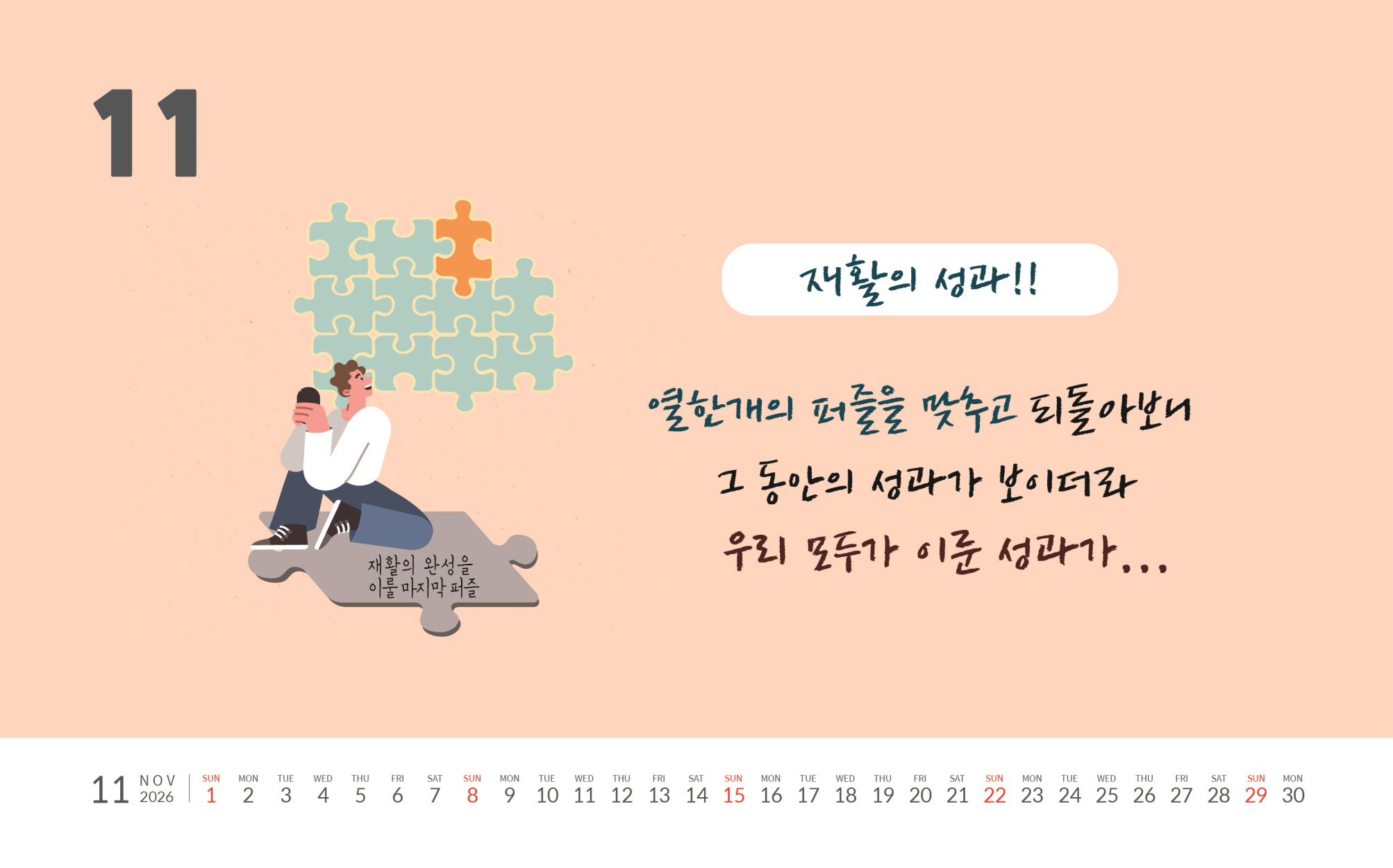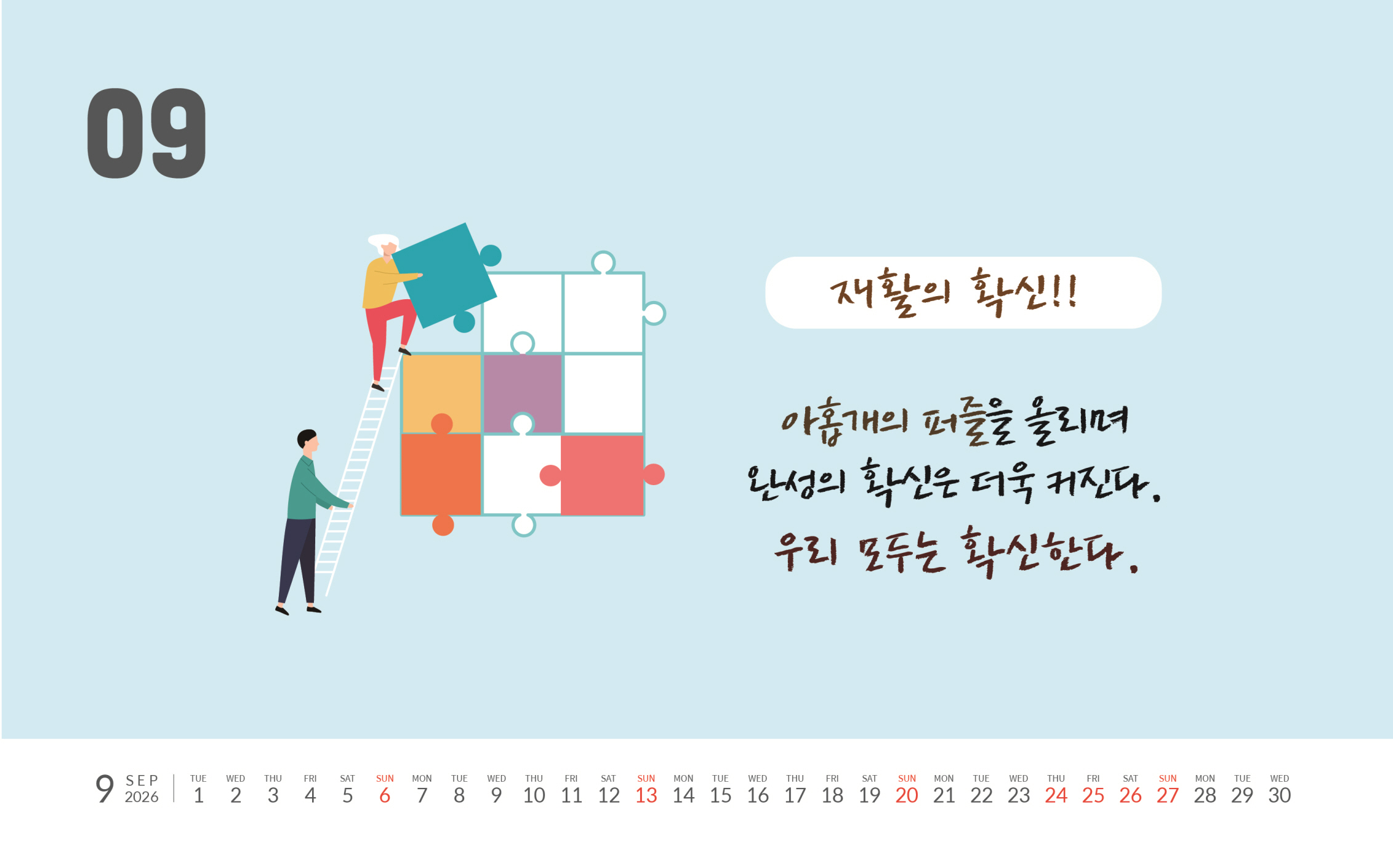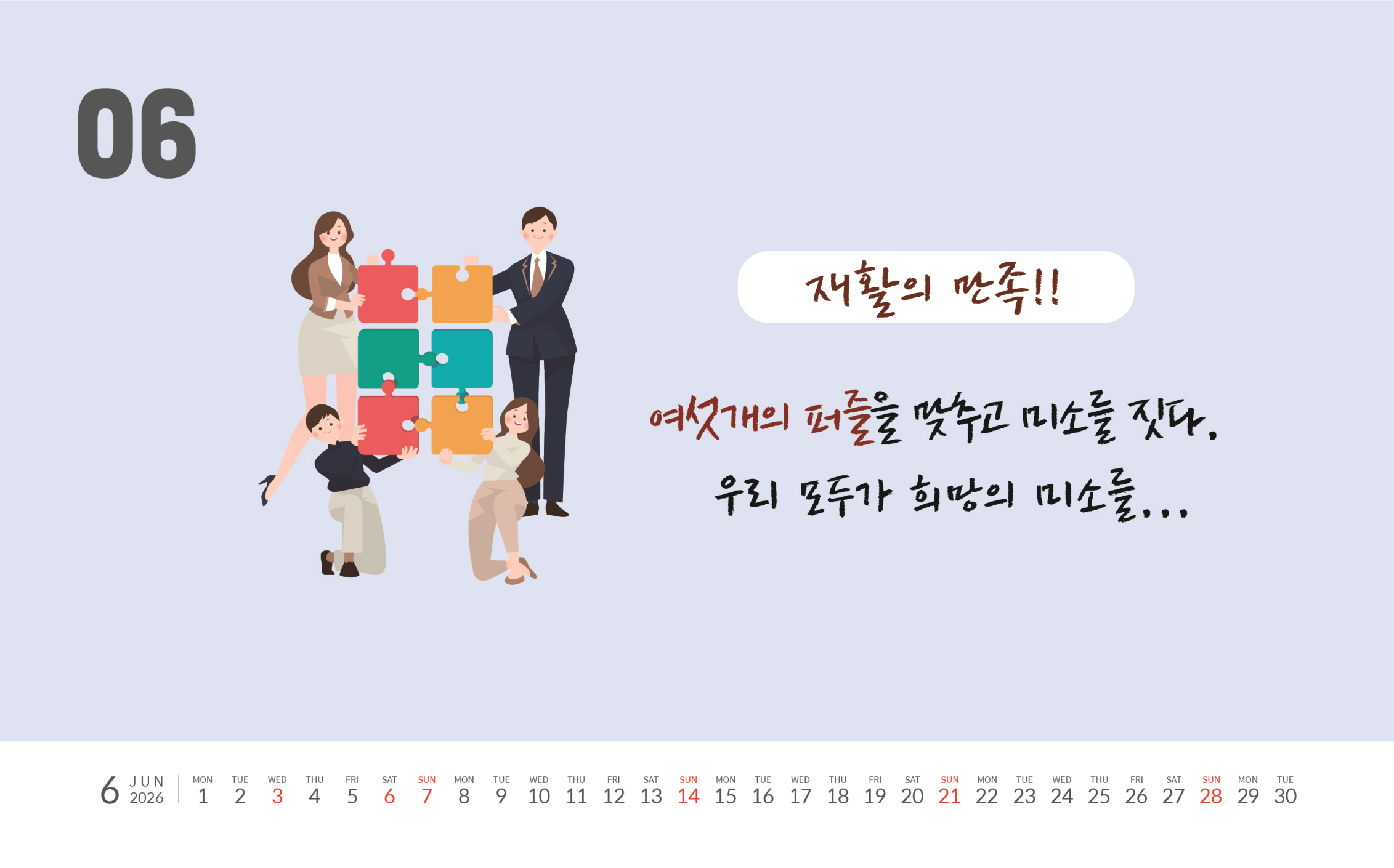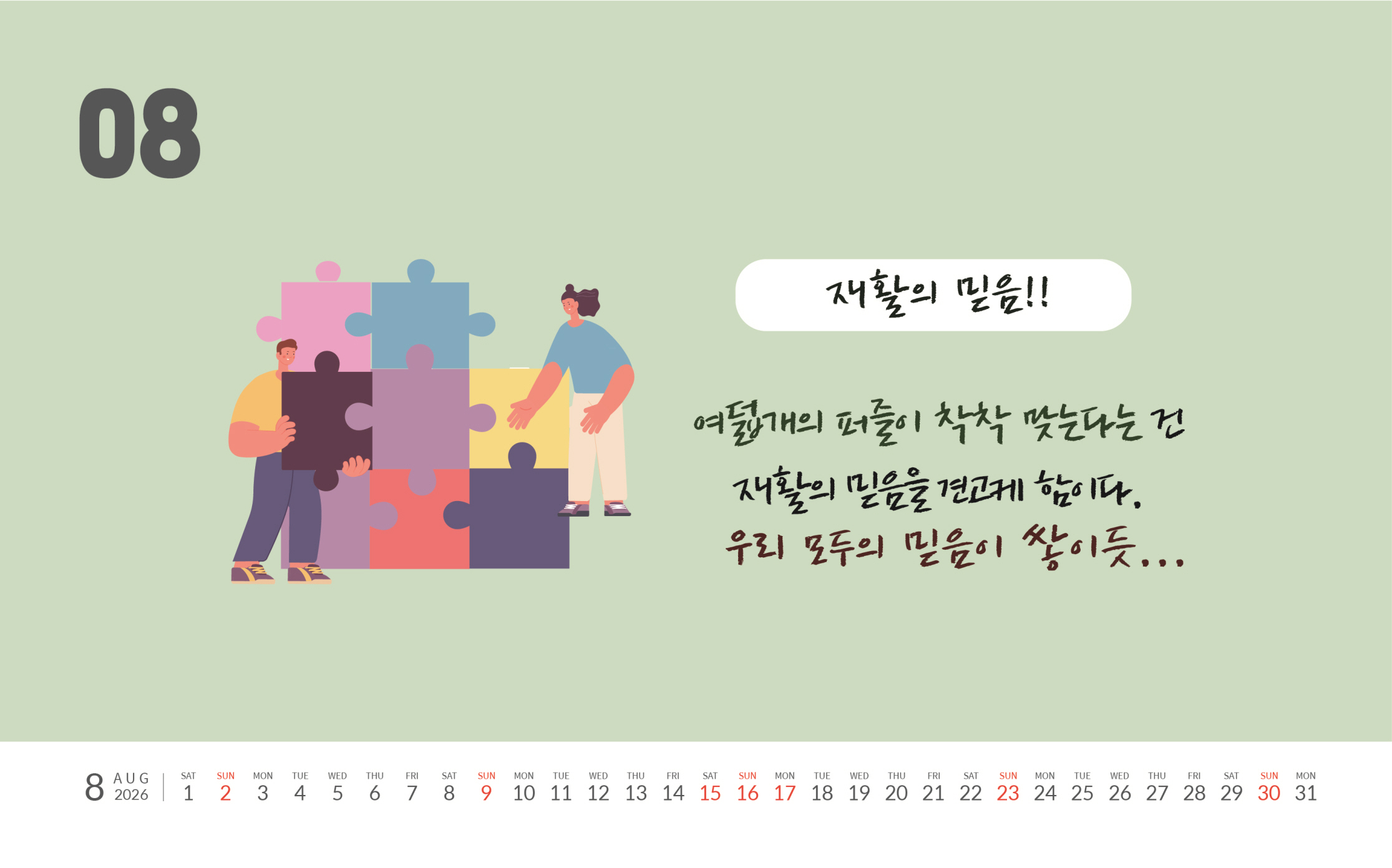 ¾È³çÇϼ¼¿ä. õ¾ÈÀçȰº´¿ø¿¡¼­ Á¦ÀÛÇÑ 2026³â Ź»ó´Þ·ÂÀ» ³ª´®Çϰí ÀÖ½À´Ï´Ù. "õ¾ÈÀçȰº´¿ø 2026³â ´Þ·Â ¾È¿¡ ¼û°ÜÁø ÀçȰÀ̾߱â"¶ó´Â ÄÁ¼ÁÀ¸·Î ¸¸µé¾îÁø ´Þ·ÂÀÔ´Ï´Ù. 1³â 12°³¿ùÀ» ÆÛÁñ 12Á¶°¢À¸·Î Ç¥ÇöÇÏ¿© ÆÛÁñ 1Á¶°¢À» ÀçȰÀÇ ½ÃÀÛÀ¸·Î 12Á¶°¢À» ¸ÂÃç¾ß ÀçȰÀÌ ¿Ï¼ºµÈ´Ù´Â ÀǹÌÀÇ ´Þ·ÂÀÔ´Ï´Ù. 1³âÀÇ °úÁ¤¿¡¼­ ÀçȰÀÇ Ã¹°ÉÀ½ ½ÃÀÛºÎÅÍ ÀçȰÀÇ µµÀü°ú ¿­Á¤, ±×¸®°í ¸ñÇ¥¸¦ ÇâÇØ ÁúÁÖÇÏ¿© ¸¶Ä§³» ¿Ï¼º¿¡ À̸£´Â 1³â 12´ÞÀÇ ¿©Á¤À» ´ãÀº... ÀÌ ´Þ·ÂÀÇ ¸Þ½ÃÁö ¸¸Å­À̳ª 1³â ³»³» ¿­Á¤À» ´ÙÇØ ³ë·ÂÇϴ õ¾ÈÀçȰº´¿øÀÌ µÇ°Ú½À´Ï´Ù. ¿ì¸® ¸ðµÎ°¡ ÀçȰ ÆÛÁñÀ» ÇÑÁ¶°¢ ÇÑÁ¶°¢ ¸ÂÃ糪°¡ º¸¾Æ¿ä~^^